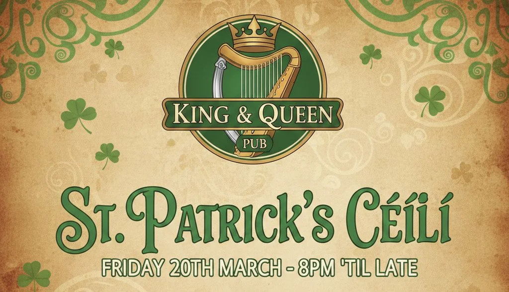 Join us for a St Patrick's Ceili in typical King & Queen style. Bring your instruments, your voice and friends and join in with everyone for a communal evening of folk songs and stories.